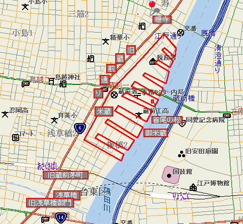 現代の地図に、江戸時代の御米蔵を重ねて書いてみたもの。赤い線で囲まれた所が、 御米蔵で、櫛の歯状に堀が北から1番、2番・・・8番堀まで有った。また御米蔵の周囲 は堀になっていた。蔵前通りの下図でいうと国道番号の”6”辺りに鳥越橋があり、茅町 から出た駕籠は直ぐのこの橋で、賊の様子をうかがった。御米蔵が終わって間もなく、 榧寺が見えてくる。